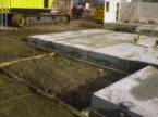 Verlegung von Bodenplatten auf vorgefertigte Fundamentbalken   Jede Kolonne besteht, je nach Anforderung an das Bausystem, aus